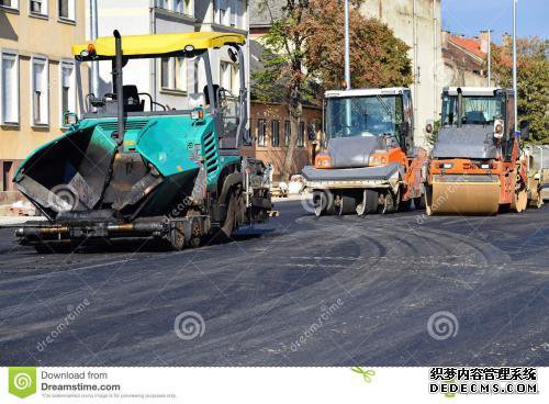 印第安人路面将热沥青浇在狗的路上,并用压路